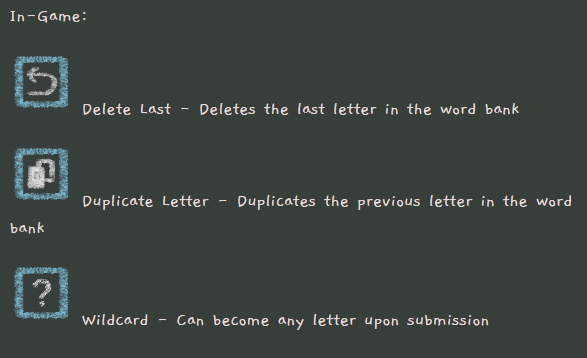 We used the walls around the player to submit/reset the word that is currently collected by the player. For visual clarity, we switch the color to show what function a wall would do with the current list of letters selected.