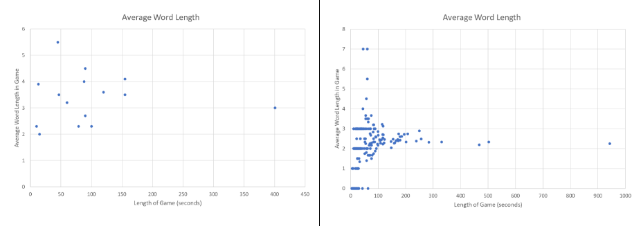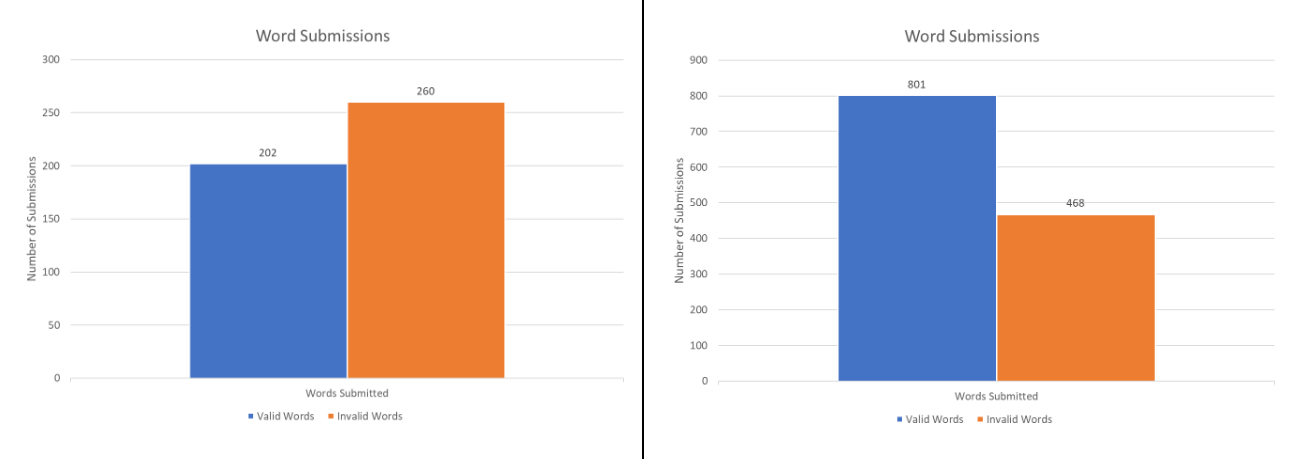This project required a tremendous amount of balancing. We had to find the right amount of letters to spawn for the player to collect and also check if players were motivated enough to create long words. We tracked this data by sending data gathered through events in-game to a google spreadsheet and analyzed 100 playtest data. We gained this data by first creating mock-up predictions of what we should get and comparing them to the actual data gathered.